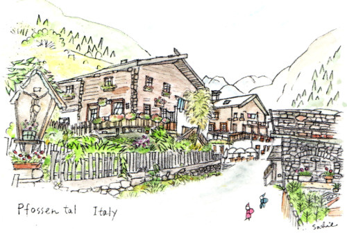 ●フォッセン谷は 5300年前のアイスマンの故郷 5,300年前のアイスマンが眠っていた、イタリアとオーストリアの国境にあるシムラウンの山。その氷河が作った谷がSchnalstal シナルス谷。 その枝谷のPfossental フォッセン谷を分け入っていくと、行き止まりにCasera di Fuori カセラ・ディ・フォーリの集落(1693m)があるのです。 アルプスの高い雪山の麓、広大なアルムに囲まれて、石ぶきの家畜小屋、チーズ小屋、野菜畑など・・ 木作りで古い小さなガストフのテラスでは、ハイキングのお客さんたちがお茶をしています。 そんな本当に懐かしい、ほっとする風景が目の前にあらわれるのです。 モニカ に出合ったのはそんな谷でした。 |