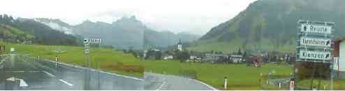 【Weibenbachで左折する。晴れていればここを右折してレヒ渓谷を少しさかのぼる=多分観光地から離れた、ひなびた風景を期待=予定していたがまた次回。この教会はまるでロケット・宇宙船だ】