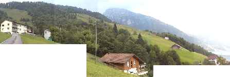 【Satteleggサッテルエック峠を過ぎて、道は細い道をかなり走っていきます・・・大丈夫でしょうか?道を間違えたのかも??・・・ダムが見え、湖があり、雪山がその向こうに見えました。教えてもらったInnerthalインナータール・・・良さそうです・・・泊まれそうな建物?・・・唯一、1軒のレストランだけです】