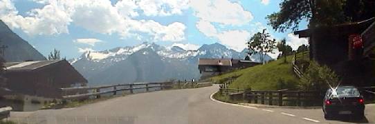 細い、車がすれ違うのも結構大変な旧道です。昔の名残の街道の並木、宿屋、牧草地。そして先ほどの道に比べ標高が高いので、雪山がはっきりまじかに見えてきます。】 47.jpg