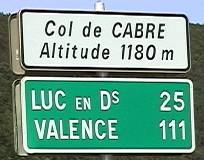 Col de Cabre カブル峠(1180m:89-3位)に到着です。あまり見晴らしのきく峠ではありません。わずかに東に遠望が開けている程度。にもかかわらず観光案内のボードが。それも峠の東側のみの案内です。今まで走ってきた峠にはあまり案内板そのものも多くなかったのですが、片方だけの案内は珍しいのです。ここはプロヴァンスアルプ・コートダジュール州(東側)と、ローヌアルプ州(西側)の境、東側が観光やハイキング整備などに力を入れていることからなのでしょう。どこの国でも行政区が変わった地域で、道路や観光の整備の差を感じますね。
