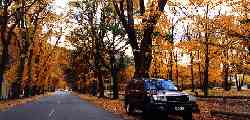 沿道はまだ紅葉にも黄葉にもやや早いのですが、色づいているのもありました。私の目にはやはり黄葉にみえました。木の上では赤く見えても地面に落ちると枯葉色なんですね。落ち葉も赤いのは、ツタ位でしょうか? (romeosierra2さんから:2000/10)