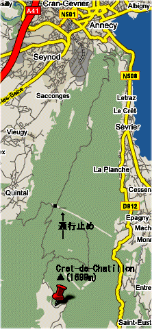 1998/2002年に来たアヌシーは若干土地勘もあるのですが、目的の峠への道はさっぱり見つかりません。町の周囲・駅の辺りをぐるぐる回りやっとそれらしい道路に出ますがそこに「Cret-de-Chatillon」の表示は無く、代わりに「Semnoz」の表示・・さてそれはどこなのでしょう?