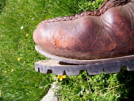 ●靴底張替えなどの経緯・・ ・2005年秋:近くの修理屋で「専門店でないと、トレッキング中にべロッとはがれてしまう」と言われ、ネットで見つけた「ミスタークイックマン」という修理屋に写真を添付し状況を書いて「このTimberlandの靴底は、全面張替え可能か」と確認の上、左右6,500円+往復送料で張替え。 ・2005年秋の旅の後、かかとの一部に剥がれを見つけ、無償再修理してもらう。かかと部分はクギ打ち補修されていた。 ・2006年の旅では無事だったが・・今回2007年の旅半ばで前の部分が剥がれた。 ![]() 【靴の修理記録:2005年の張替えと再補修】 |