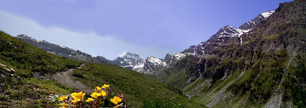 ![]() 【s802.jpg:トラヴェルセッテ峠まで1.5時間の引き返し点で記念撮影。左上モンテヴィーゾ、真後ろヴィーゾ小屋】 |